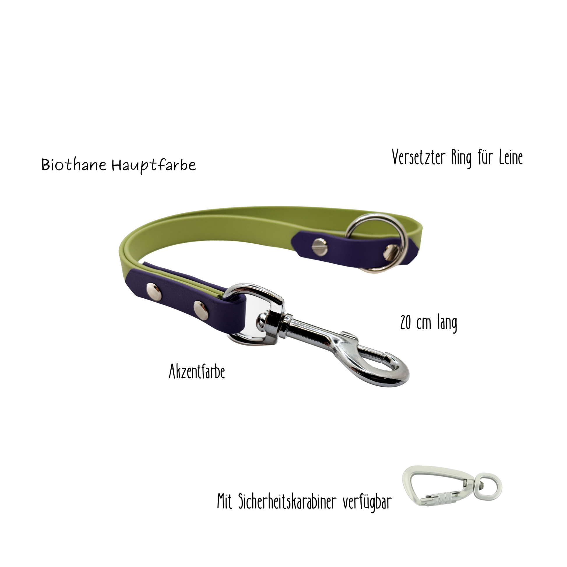 Dieser 30 cm lange Kurzführer aus hochwertigem Biothane bietet maximale Kontrolle in jeder Situation. Dank des seitlich angebrachten Rings lässt sich eine normale Leine bequem befestigen. Die versetzte Position sorgt für eine angenehmere Handhabung, besonders wenn die Leine unter Spannung steht. Robust, wetterfest und leicht zu reinigen – der ideale Begleiter für den Alltag mit deinem Hund.